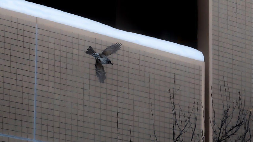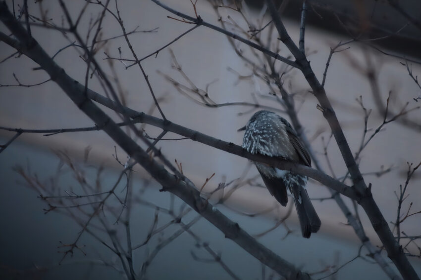 地下鉄琴似駅からJR琴似駅へと続く、賑やかな大通り。街路樹の葉はとうに落ち、枝は鋭い針のように冬の空を突き刺しています。夕暮れ時、家路を急ぐ人々の吐息が白く消えていく傍らで、ムクドリたちは「ねぐら」へと集まってきます。 …