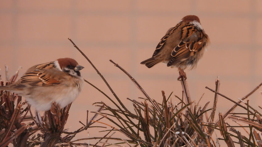 午前七時のマニュアルフォーカス。スズメたちが遊ぶ冬の構図