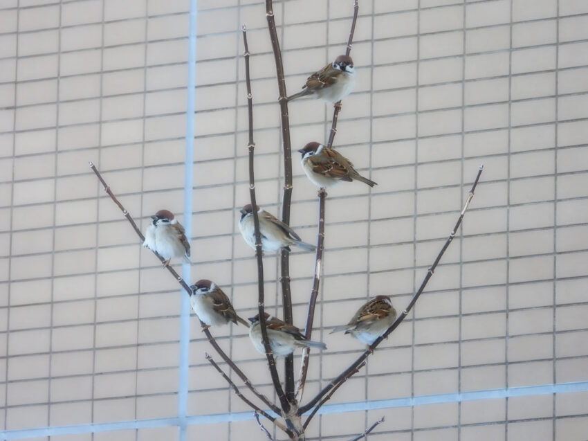 極寒の中、撮影に行っていると偶然にも面白い写真が撮れます。フロントシティ琴似の中庭の枯れた木に7羽のスズメがわざとらしく、可愛い一コマ Nikon Coolpix p1100 #Nikon #ニコン