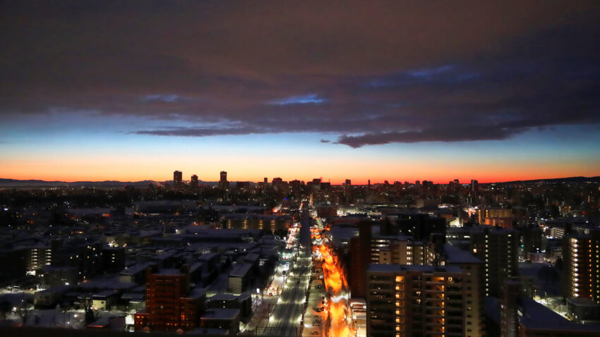 -8℃の朝焼けは美しい!銀世界に刻々と陽が昇る時の光は、空が青く、陽はオレンジになり美しさを増す。この景色の中、琴似から札幌の街は希望に満ちた街へと変わる。 CanonEos5DMarkⅣ