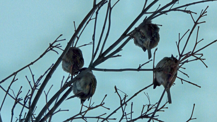 その静寂を破る、小さなスズメたちのさえずり。木の枝に身を寄せ合い、まるで互いのぬくもりを分け合うかのように丸くなっている。一羽が毛づくろいを始めると、隣のスズメはうつらうつらと居眠りをしている。かと思えば、突然数羽が飛び…