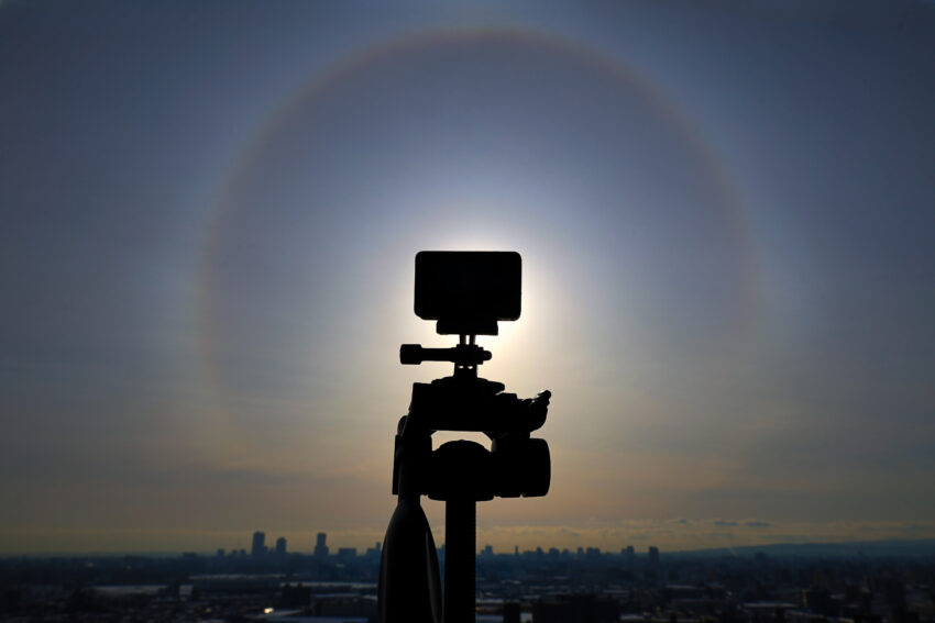 ハロ(日暈)と呼ばれるを捉えた写真です。 太陽の周りに現れる虹色の光の輪のことをハロ(日暈)と呼び、大気光学現象の一つです。空の高い所に広がる「巻層雲(薄雲)」を構成する氷の粒が太陽光を屈折させることで発生します。ハロが…