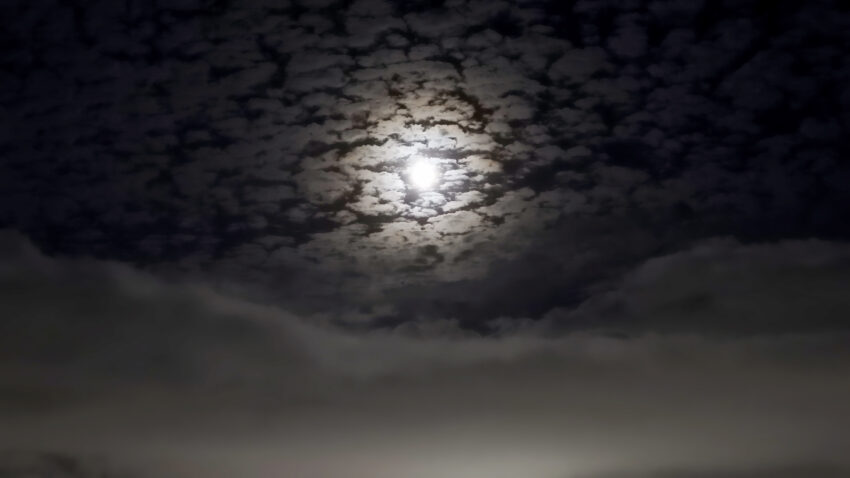 雲の後ろに、ほぼ満月が雲の揺らぎに顔を出す瞬間が美しい。