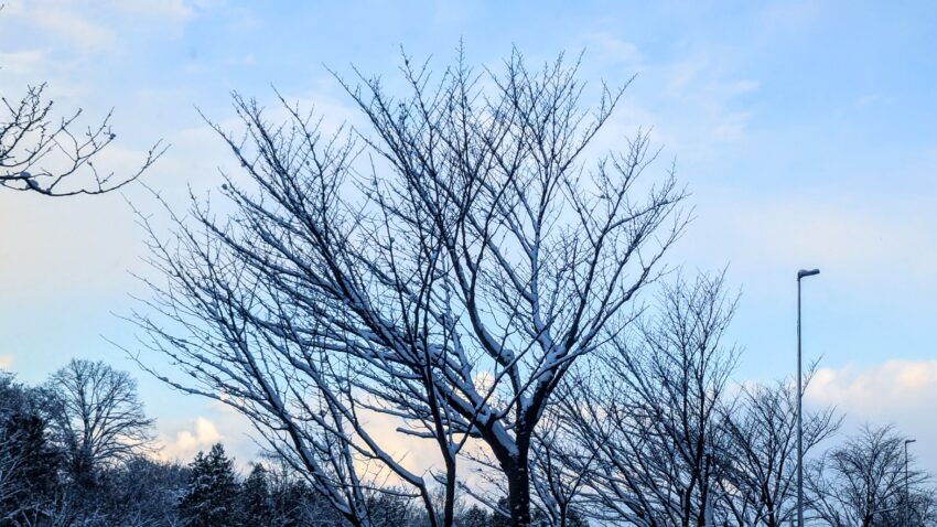 朝、いつもの様に5時半に起き、いつもの様に外を見ると雪が降って居た。6時を過ぎ空が明るくなって来て、一面が白銀になって居た。