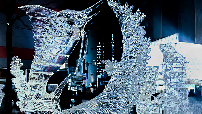 大通会場の賑わいから離れ、すすきの会場「すすきの氷の世(すすきのアイスワールド2026)」へ向かうと、そこは一転して静寂に包まれた氷の芸術世界だった。煌びやかにライトアップされた魚入りの氷像や、氷の彫刻コンクール作品が、街の灯りを受けて幻想的に浮かび上がっている。