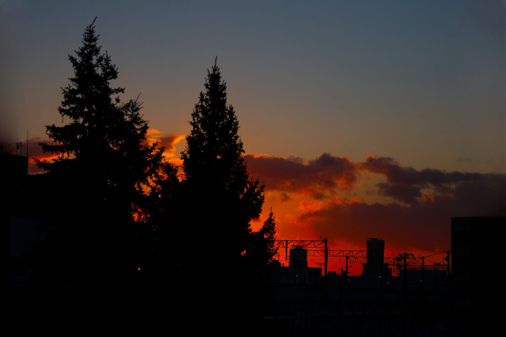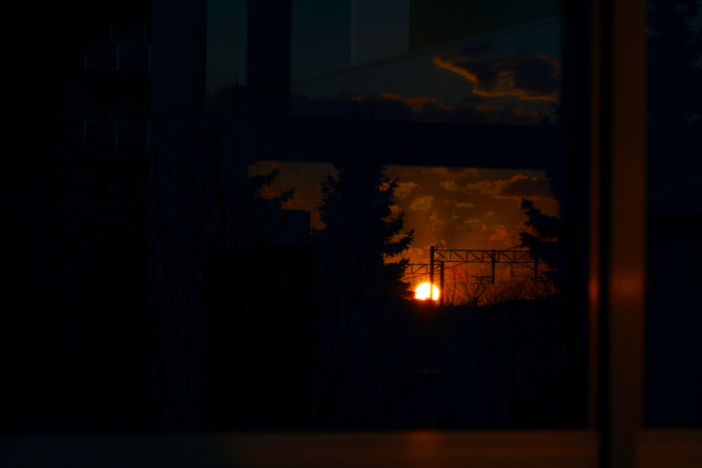 シャッターを切りながら後ろを見ると、窓に反射した朝焼けが気になり撮った。