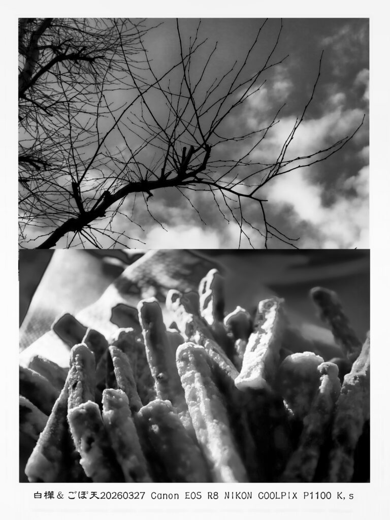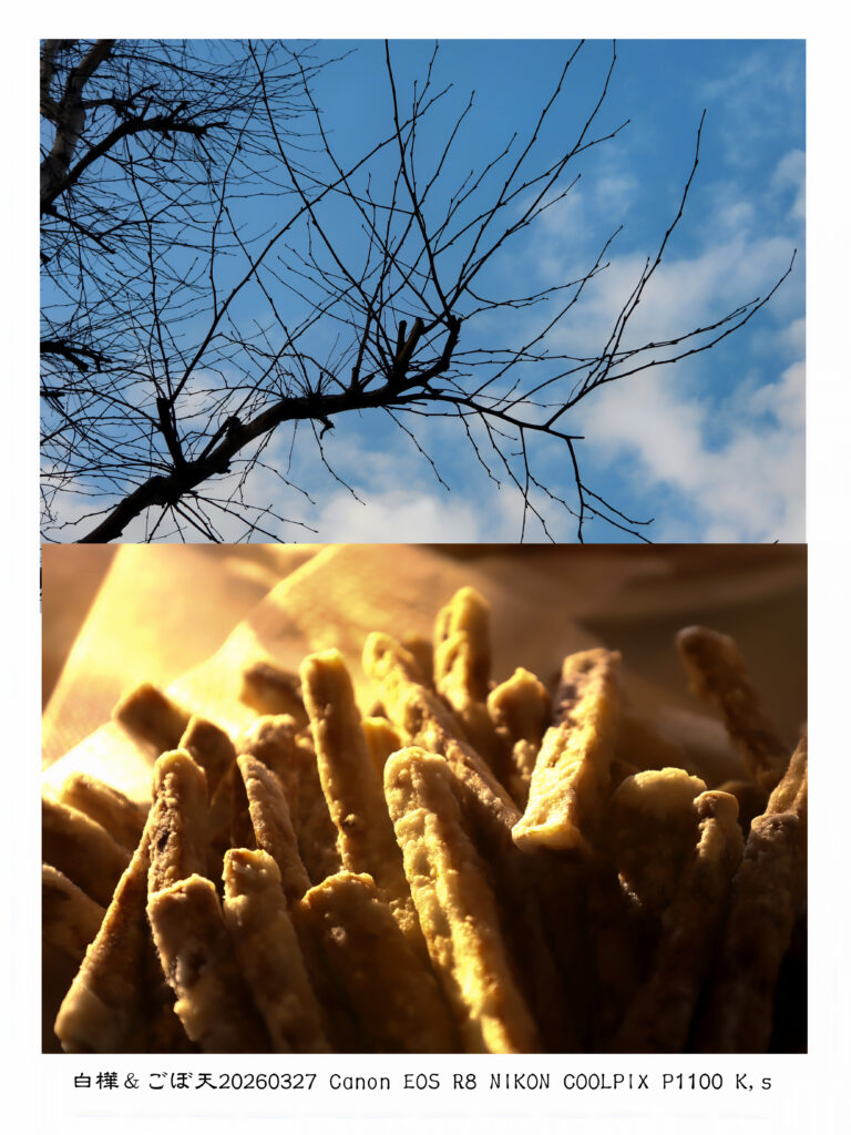 今日の一枚 白樺とごぼ天 20260327 Posted on 2026年3月27日2026年3月27日 by kotoni.mirai 今日の朝の気温は4℃と+温度が多くなって来た。あちこちに春の芽が出ている事が感じるし、朝の日も変わってきている。妻が朝の4時半から天ぷらをつくりその天ぷらに朝陽が差す。外に出れば、ゴルフの練習に行く途中に白樺の木の小枝が伸び葉の芽で始めている。自然界は何があっても必ず再生する。 共有: Facebook で共有 (新しいウィンドウで開きます) Facebook X で共有 (新しいウィンドウで開きます) X いいね:いいね 読み込み中…